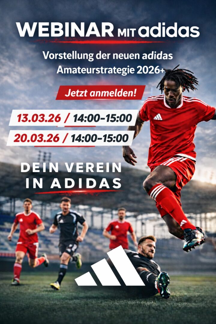 Als offizieller Partner des Fußballverbandes Rheinland lädt adidas alle Vereine im Verbandsgebiet zu einem interaktiven Teamsport-Webinar ein, das neue Impulse für den Vereinsfußball geben und die adidas Amateurstrategie 2026+ vorstellen soll. Im Mittelpunkt stehen dabei die enge Partnerschaft zwischen dem Fußballverband Rheinland und adidas, der Austausch mit dem stationären Teamsport-Fachhandel sowie die gemeinsame Weiterentwicklung des Amateurfußballs.