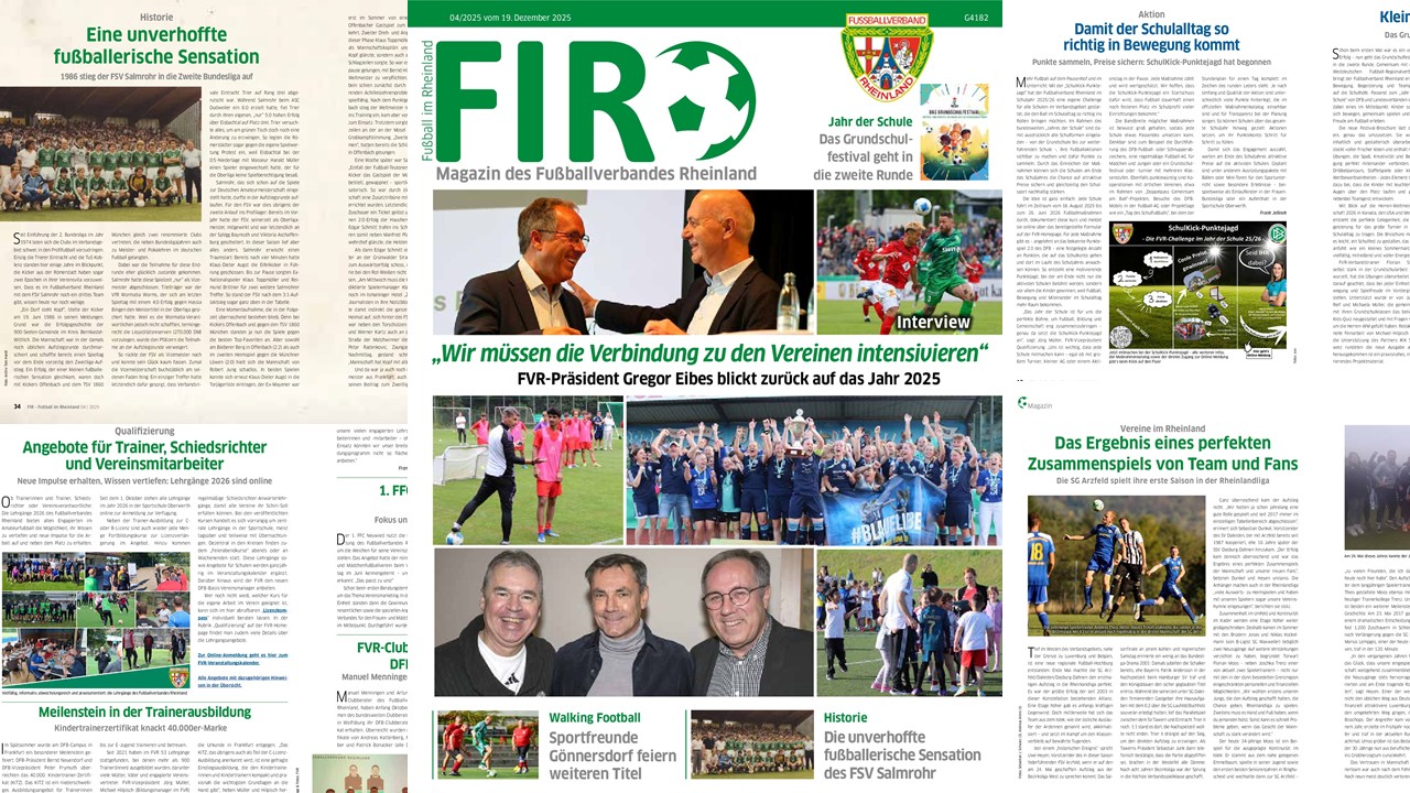 Vier Mal im Jahr erscheint unser mittlerweile rein digitales Verbandsmagazin „Fußball im Rheinland“ – in der aktuellen Ausgabe unter anderem unter anderem mit einem ausführlichen Interview mit FVR-Präsident Gregor Eibes, wir richten den Blick unter anderem aufs Jahr der Schule, auf Walking Football und auf Christian Heintz aus Bodenbach in der Vulkaneifel, der mit dem 1. FSV Mainz 05 Deutscher Meister im Amputiertenfußball wurde. Wir porträtieren die SG Arzfeld und zeigen auf, wie und warum die Sportfreunde Schönstein erfolgreich im DFB-Punktespiel 2.0 sind.