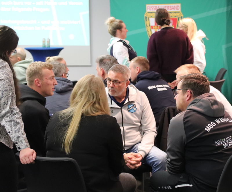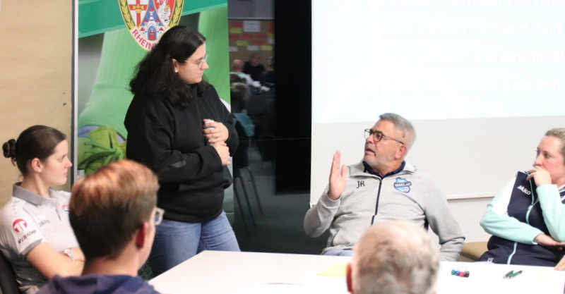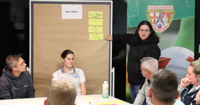 Im Anschluss teilten sich die Teilnehmenden, basierend auf den Säulen der Strategie „Selbstverständlich weiblich“, in drei thematische Workshops auf: „Mehr Aktive gewinnen“, „Qualifizierung für Trainer*innen“ und „Vielfältige Funktionsgruppen im Verein“. Unter der Leitung von Pat*innen des FVR entwickelten die Gruppen in intensiven Diskussionen kreative und praxisnahe Ideen, um den Mädchen- und Frauenfußball im Verband langfristig zu fördern und nachhaltig zu stärken. Im Anschluss präsentierten die Pat*innen die Ergebnisse im Plenum – ein reger Austausch, der zeigte, wie viel Potenzial und Leidenschaft in den Vereinen steckt.
